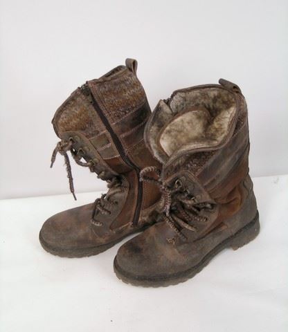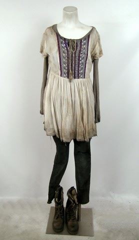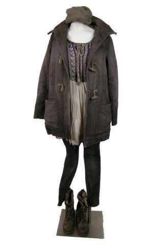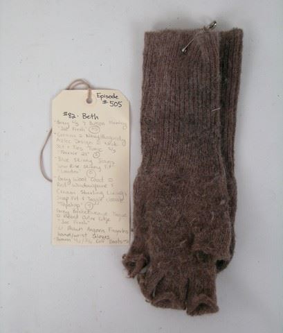 Season 5, Episode 5 - Beth's (Michelle Sabat) screen worn, distressed grey wool with red windowpane and cream shearling lining snap front "Top Shop" jacket, white with blue and red embroidery on the front "Forever 21" dress. grey long sleeve with buttons at the neck "Joe Fresh" shirt, grey wool beanie, grey wool gloves, and brown leather and wool lace up the front boots. Includes wardrobe tag.