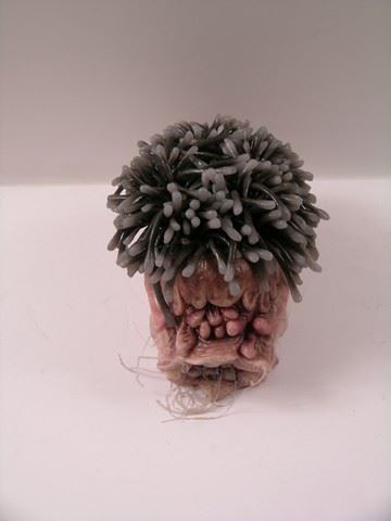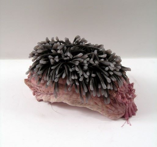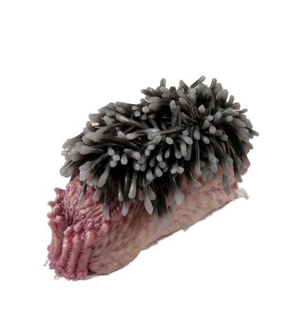 This Bloom creature resembles dark-grey sea anemone tentacles tipped, with light grey atop a pink rectangular base. Made of silicone. Approx. 14" long.