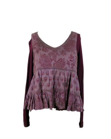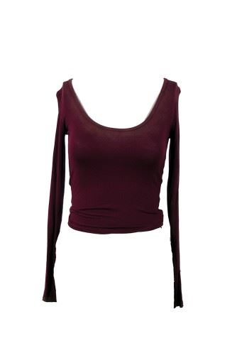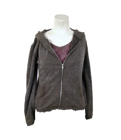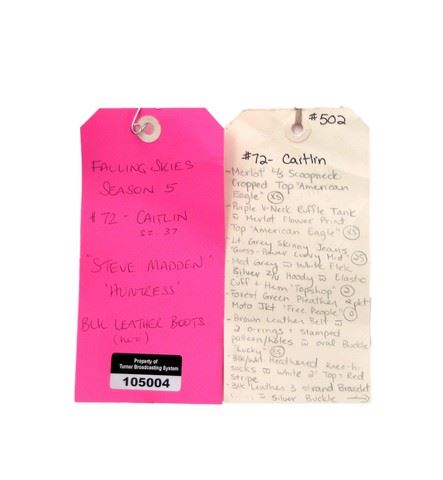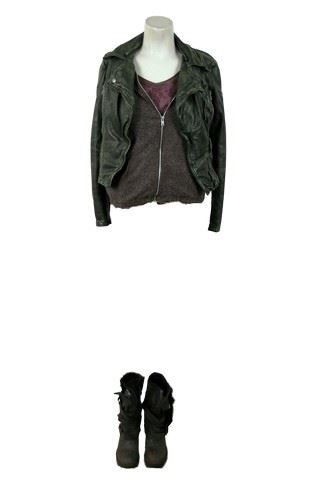 Episode 502 - Caitlin (Julia Sarah Stone) screen worn, distressed forest green pleather two pocket 'Free People' motorcylcle jacket, (size XS) medium grey with white flek 'Topshop' zipper front hooded sweatshirt, (size 2) purple ruffle v-neck with with floral print 'American Eagle' top, (size XS) merlot long sleeve scoopneck 'American Eagle' cropped top, (size XS) and black five buckle with wrap around straps 'Steve Madden' boots. (Size 9) Includes wardrobe tag and includes Turner Broadcasting System tag #105004.