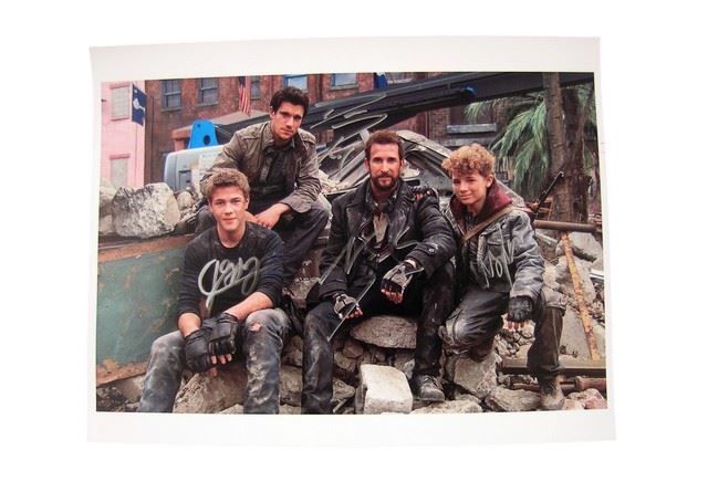 Falling Skies cast signed photo including Tom Mason (Noah Wyle), Hal Mason (Drew Roy), Matt Mason (Maxim Knight), and Connor Jessup (Ben Mason) autographed color photo. (approx. 8 1/2" x 11")