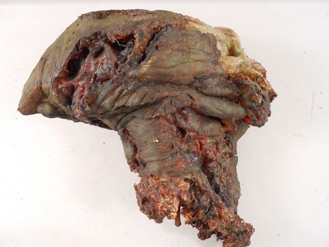 This Skitter played with fire and lost, landing at the wrong end of a powerful blowtorch. His melted, charred head detaches from his decaying body. Creatures don't always fare well in a world invaded by relentless, genocidal Esphenis, and the "Falling Skies" special effects team populated this post-apocalytic world with charred and rotting bodies like this one to prove it . The Skitters are incredibly life-like, with individual features and expressions, to remind us that they once had families and lives before the Esphenis enslaved them. Torso approx. 34" x 24" x 14". Head approx. 21" x 21" x 11".