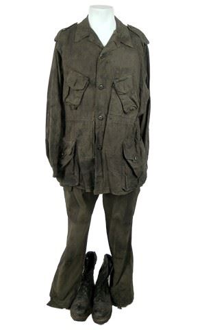 Cochise’s (Doug Jones) screen worn outfit in Season 5, Episodes 1 & 2.  Cochise epitomizes the Volm sensibility, with his all-hands-on-deck military motif jacket replete with oversized pockets and drawstrings common to every armed service life-form with a barrel chest.  His cargo pants, with unusually stylish button-flaps for a Volm, provide added storage in classic green khaki.  Cochise falls in love with everything human, so his “Rocky” boots just might be a sentimental nod to American cinema.  A genius with detail, Cochise ensured that his attire has been properly “distressed” to show minimal wear and that his two wardrobe tags have remained intact.