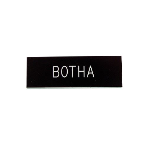 Dingaan Botha's (Treva Etienne) black name tag, with "BOTHA" in caps. Made of plastic, with black background and white lettering.
