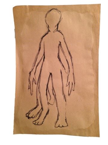 Dornia sketch on construction paper . The paper has been crinkled and distressed for use during producion with what appears to be water stains along the edges. slightly. (17.5"x12").