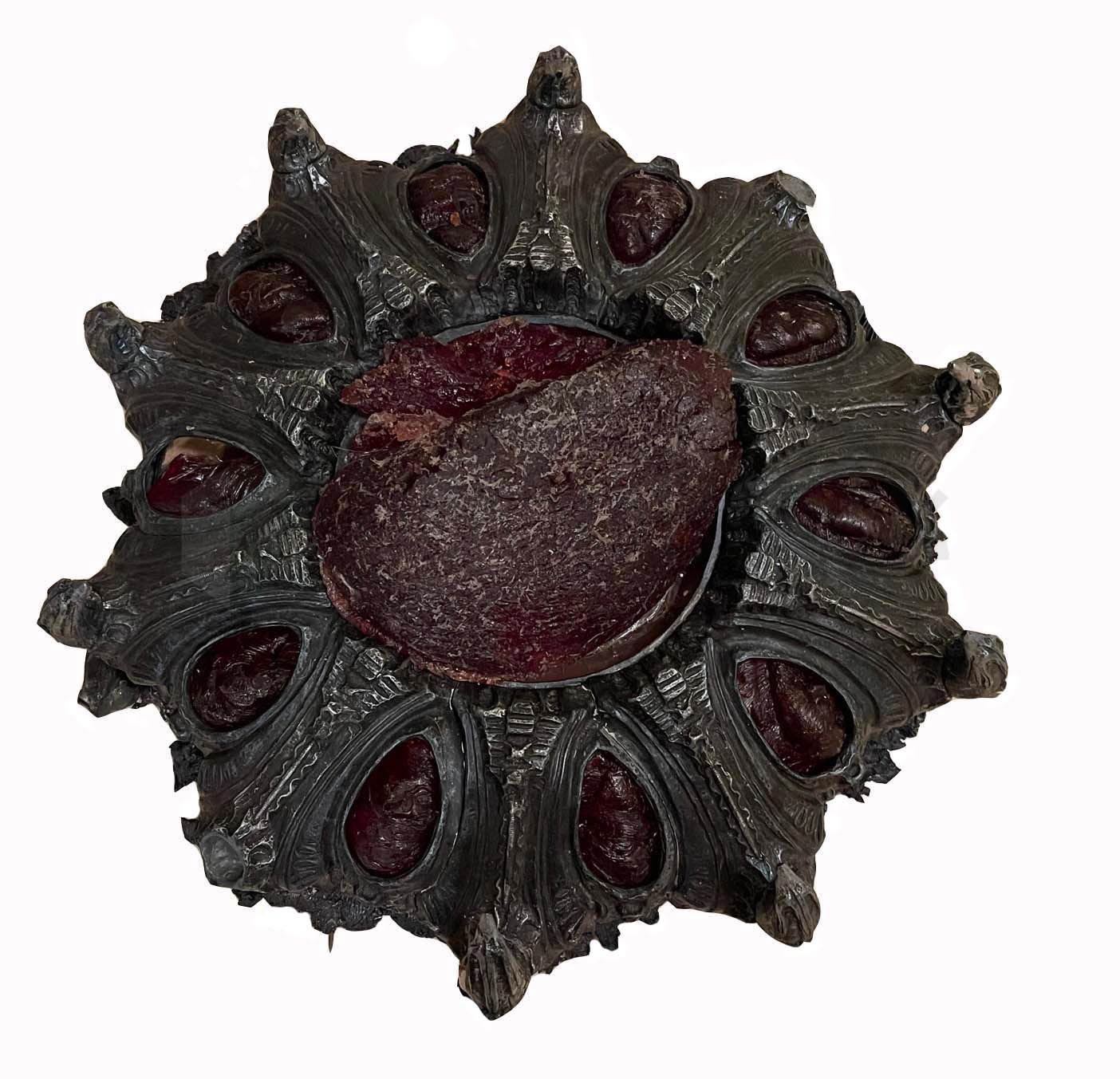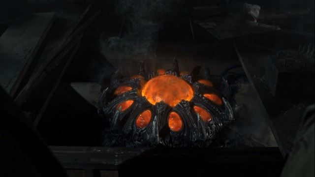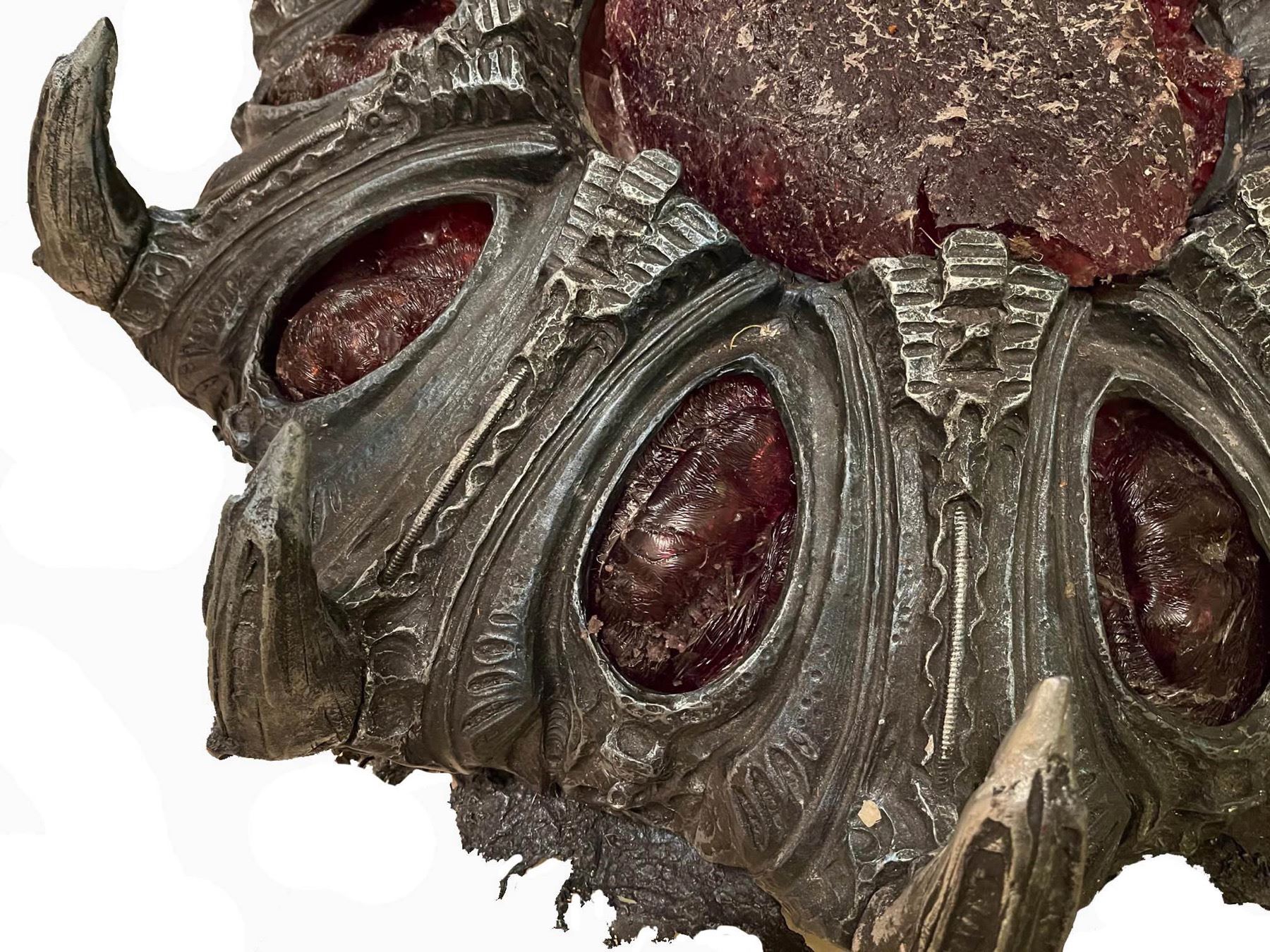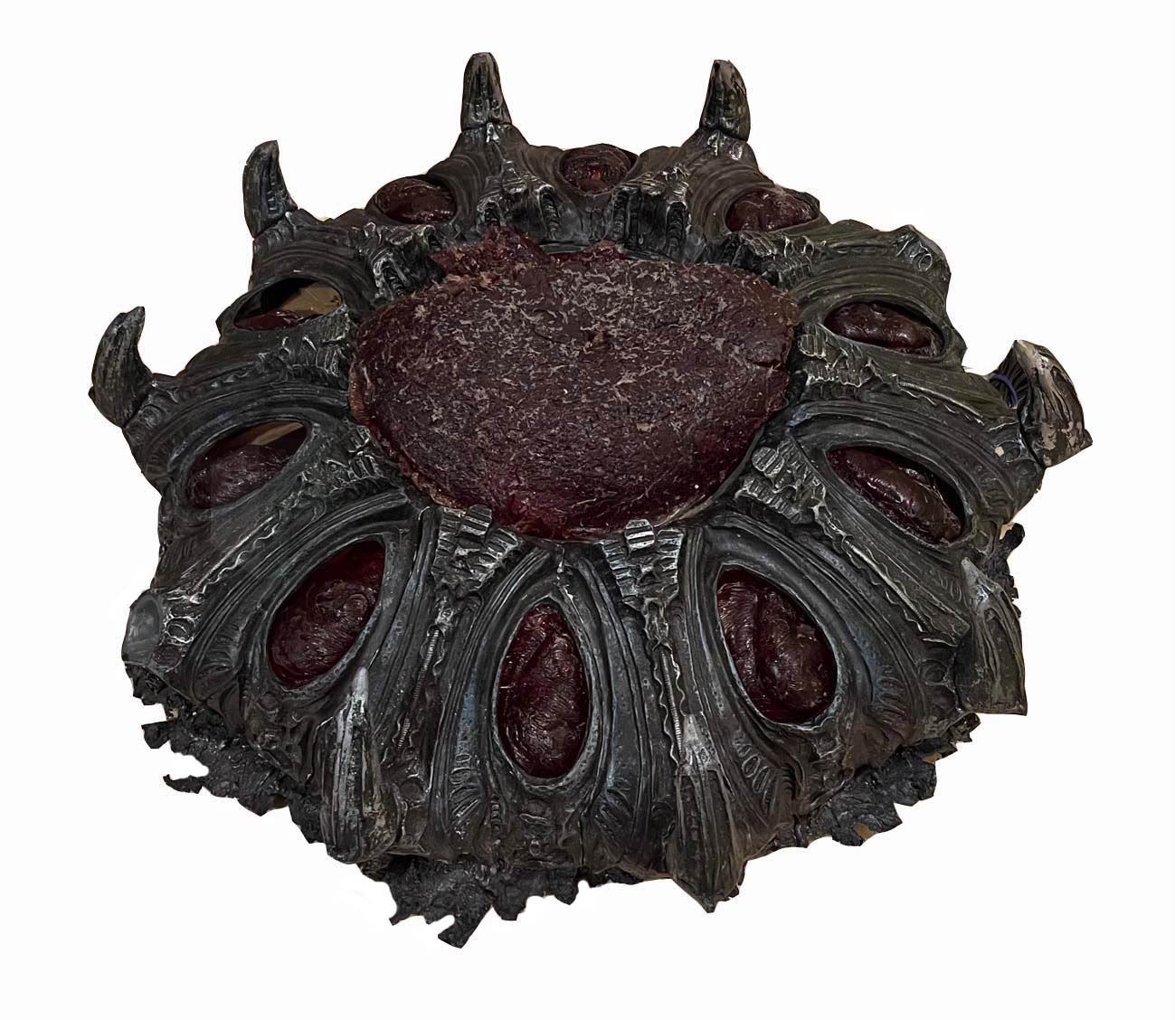 Large communications hub used in the Steven Spielberg science fiction show Falling Skies. This piece was used as a hub of communications by the Espheni and was secured in a large whisky crate, where the main protagonists find and destroy it. This piece is made of cast resin and features various red silicone pods on the top and around the outside. The pods are starting to disintegrate but remain in good condition. This piece features LED electronics and a remote controller to activate them. The electronics do not work as originally designed but do light up for a moment once the device is plugged in. This is a very large and heavy item and will require special shipping. This piece remains in excellent, production used condition.
