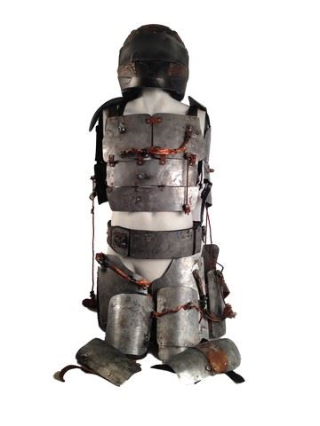 Stunt Faraday Armor Suit with chest plate, shoulder pieces, waist armor, leg armor and one arm piece. (One lower arm piece is missing) Made of tin with leather straps and copper wiring.