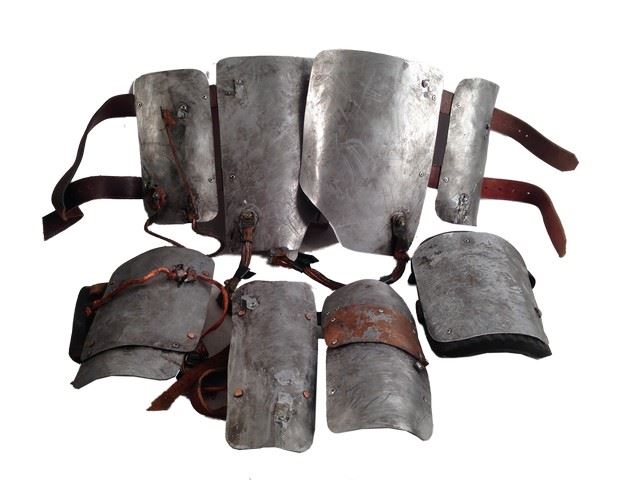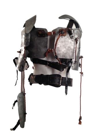 Stunt Faraday Armor Suit with chest plate, shoulder pieces, waist armor, leg armor and one arm piece. (One lower arm piece is missing) Made of tin with leather straps and copper wiring.