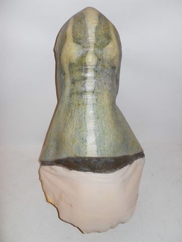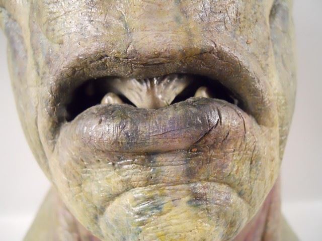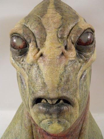 This Overlord's 2-foot high head is presented here after he left this mortal coil, but he retains his overtly reptilian features including no nose (solely nostrils) and reptile skin. Made of latex. Approx. 25" x 13" x 13".