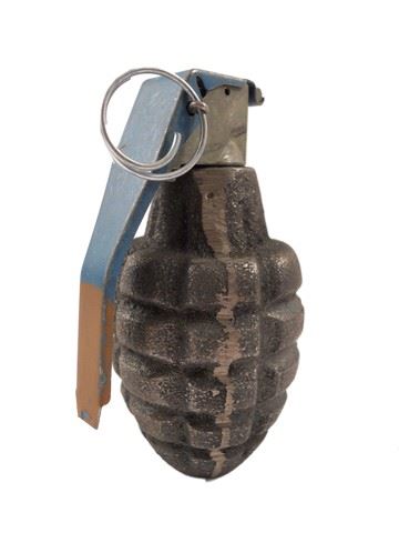 Metal grenade with ridged exterior, hollow interior, and intact pin (non-functional). Approx. 5" x 3" x 2".