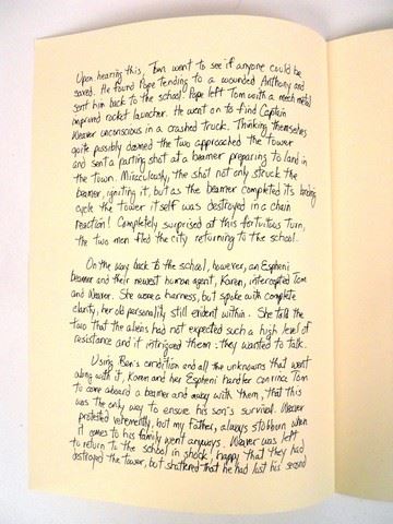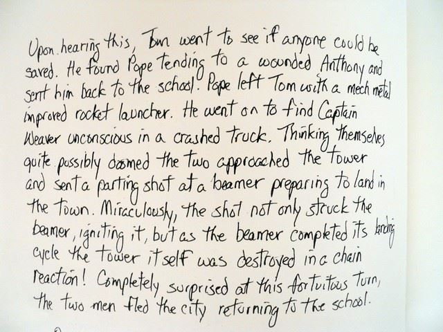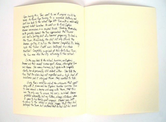 Season 5, Episode 10 (Series Finale) - Ceremonial candles and written account of 2nd Mass history fighting the Espheni, which appears in close-up during Hero moments in "Falling Skies." Prepared by the show's Prop Assistant Jordy Wihak.