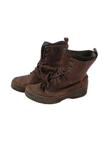 Jamil Dexter's (Brandon Jay McLaren) screen worn in Season 2 brown leather "Wind River" boots with green and blue flannel lining and rugged soles. Minimally "distressed" for production. Includes wardrobe tag.
