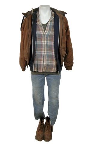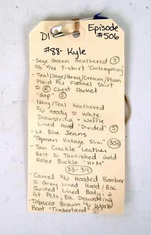 Episode 506 - Kyle (Brendan Meyer) screen worn, camel zipper front hooded with grey lined hood with quilted lining bomber jacket, heather navy zipper front with white drawstring long sleeve 'Divided' hooded sweatshirt, teal, sage, grey, cream, and plum plaid long sleeve button front 'Gap' shirt, sage green heather short sleeve v-neck 'Contemporary' t-shirt, tan crackle leather with tarnished gold roller buckle 'H&M' belt, light blue denim 'Topman Vintage Slim' jeans, and brown lace up the front 'Timberland' boots. Includes wardrobe tag.