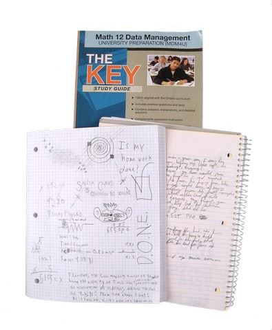 Matt Mason's (Maxim Knight's) spiral notebook from school with handwritten notes, comical doodles as if he were daydreaming in class. Also included is Matt's "Math 12 Data Management University Preparation" study guide. Approx. 10" x 11".