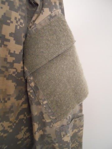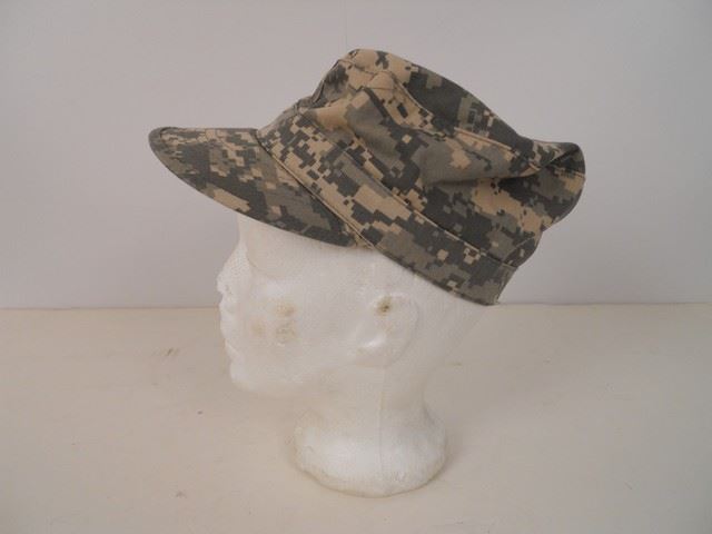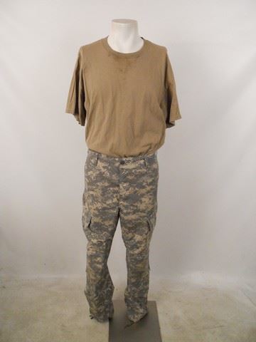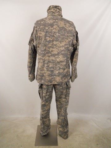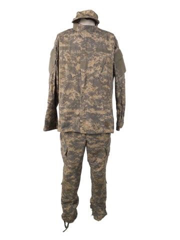 Camouflage military uniform. Includes pants with button fly and drawstring at the waist, khaki shirt, camo shirt with velcro for nametags and insignias and hat.