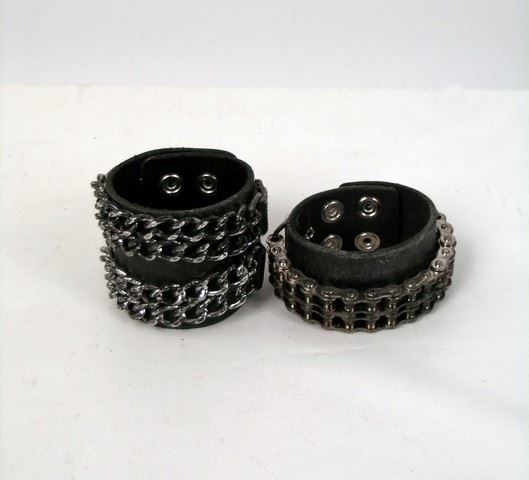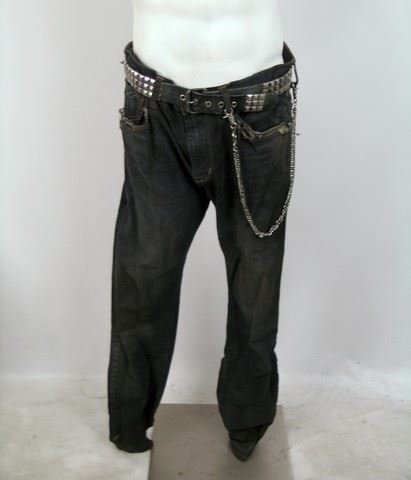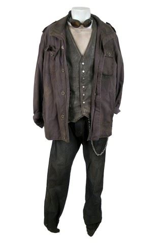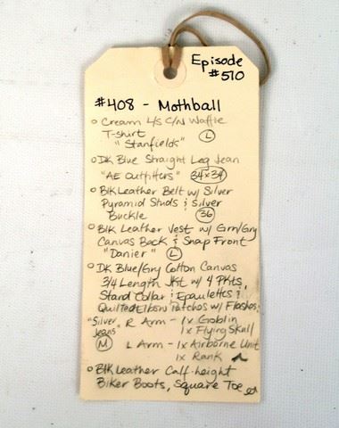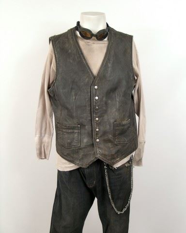 SPOILER ALERT! Season 5, Episode 10 (Series Finale) - Mothball's (Hugo Ateo) screen worn, distressed, dark blue/grey cotton canvas three quarter length with four pockets and quilted elbow patches "Silver Jeans" jacket, black leather with green and grey canvas back snap front "Danier" vest, cream long sleeve waffle weave "Stanfields" shirt, black plastic goggles, black leather with studs belt, black leather with chain bracelet, black leather with bike chain bracelet, black gloves, wallet chain, and dark blue denim "AE Outfitters" straight leg jeans.