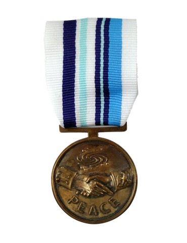This golden peace medal features a medallion with two hands shaking in a gesture of peace and a pin with wide, white ribbon adorned with blue stripes. Approx. 1 1/2" diameter.
