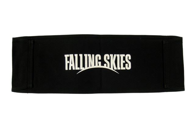 Producer's black canvas chair back with "Falling Skies" logo printed in white letters on one side. Approx. 21" x 7".