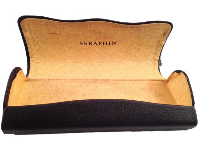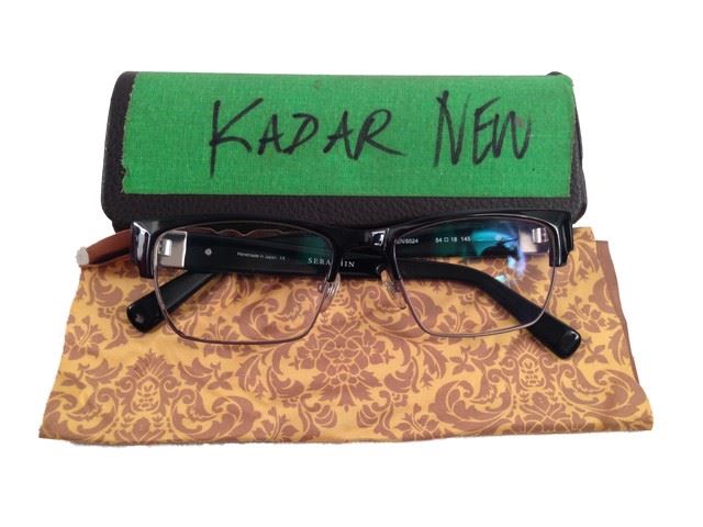 Roger Kadar (Robert Sean Leonard) screen worn in Episode #302, 'Seraphin - Van Buren' eyeglasses with non perscription lenses, carrying case w/"Kadar New" written across in green tape, and gold floral pattern cleaning cloth (6' wide).