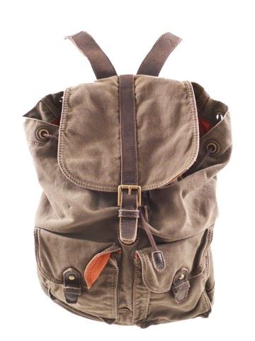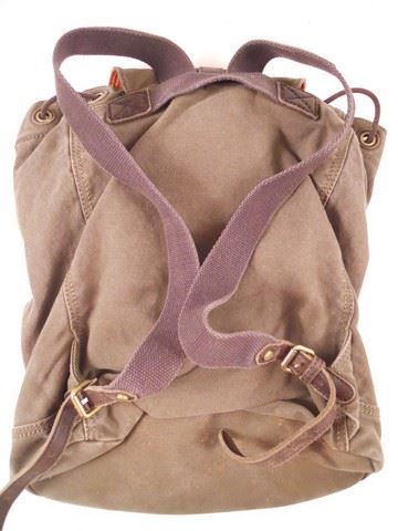 Sara's (Mira Sorvino) tan canvas backpack with leather straps. Approx. 18" x 14".