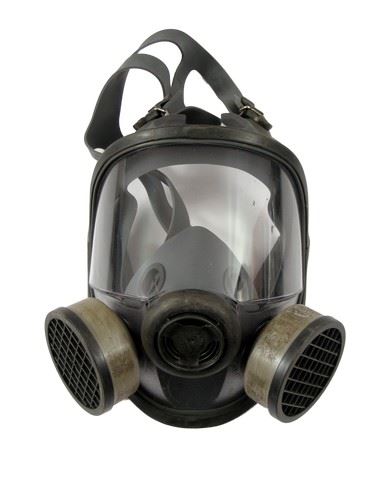 Season 4, Episode 9 (12:01 minutes) - When Cochise (Doug Jones) brings 2nd Mass members to a Volm supply depot with high levels of toxicity dangerous to humans, he instructs them to wear gas masks for protection.  This dual canister 'North' one-piece gas mask worn by Matt Mason (Maxim Knight) has green and black silicone rubber construction and a full face piece of clear plastic.