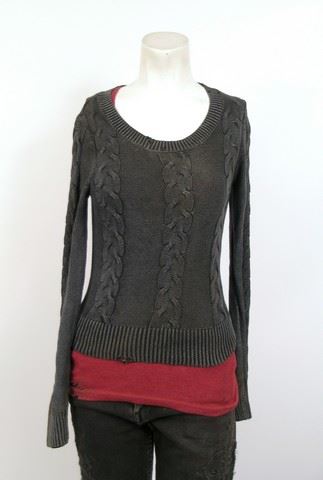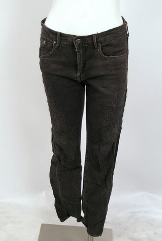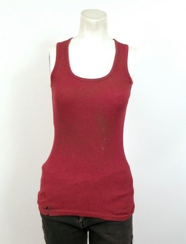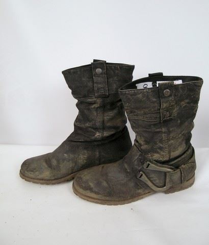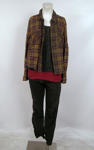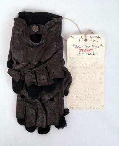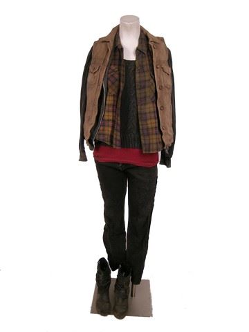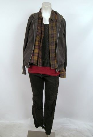 Season 5, Episode 2 - 2nd Mass #1's (Atlin Mitchell) screen worn in stunt sequences, distressed, light brown six button with four front pockets "Gap Edition" vest, grey zipper front "Divided" hoody, gold, grey, and red plaid long sleeve button front with slit in the back "I Love H8I" shirt, black long sleeve crew neck cable knit "Divided" sweater, red singlet "Suzy Signature Tee" tank top, dark brown leather fingerless perforated "Danier" gloves, and black pleather "Aldo" boots. Includes wardrobe tag.