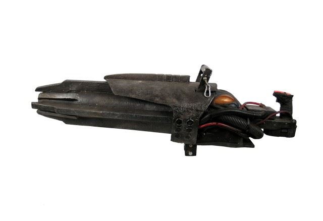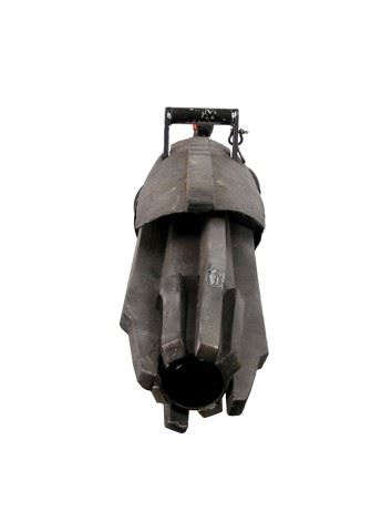 Season 5, Episode 1 (35:12 minutes) - The Gatling gun was first used by in the 2nd Mass raid on Wilson High School to find an Espheni Overlord. When the 2nd Mass is ambushed by dozens of Skitters in complete darkness, Colonel Dan Weaver (Will Patton) orders, "Let's see what those things can do!" Hal Mason (Drew Roy) and Dingaan Botha (Treva Etienne) rush forward with their Gatling guns and unleash a torrent of ammunition into the Skitter-ridden bleachers. Dingaan also uses the Gatling gun defend the 2nd Mass installation against Skitters in Season 5, Episode 2 (0:34, 0:47, 1:26, 1:35 minutes). The gun's sturdy design includes a shield over long extension arms surrounding an embedded pipe, ribbed hoses which twist 'round the front, and thin red tubes that appear to deliver fluids to the gun. A replica of a small, black alien head with red eyes is seated in the middle of the gun's housing, looking down the gun's barrel as if guiding the shot. Grey and red colors. This "motorized" Gatling gun has an interior spinner motor and tactical lights. Made with drill motor, steel, foam, latex, and LED lights. Includes Turner Broadcasting System sticker #105101. Approx. 54" x 15".