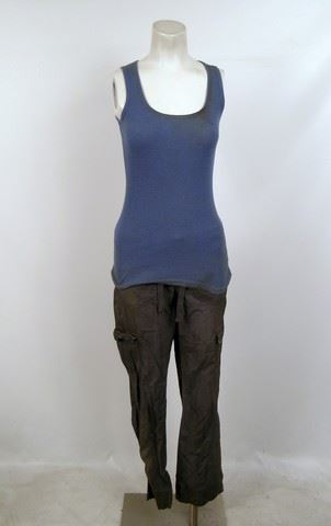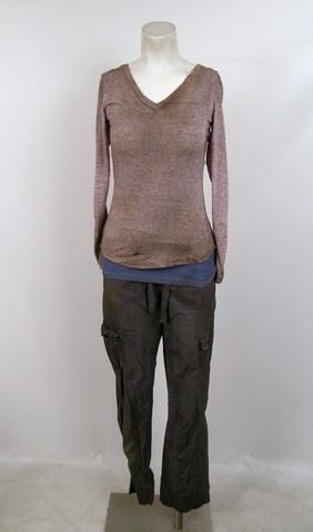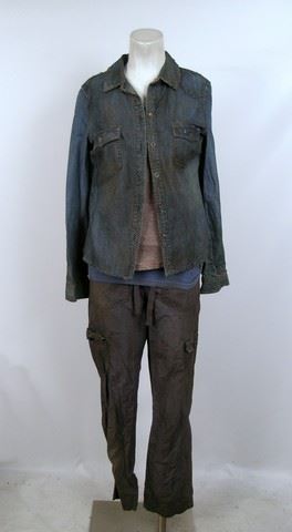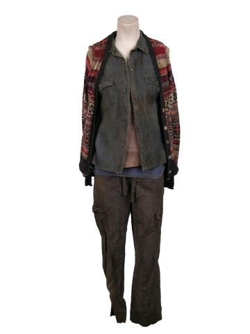 SPOILER ALERT! Season 5, Episode 10 (Series Finale) - 2nd Mass woman's (Angela Uyeda) screen worn, distressed, red, navy, and cream wool "H&M" sweater, blue denim long sleeve button front "Old Navy" shirt, grey long sleeve "G:21" t-shirt, purple ribbed "Suzy" tank top, and grey elastic waist "George" pants.