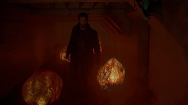 SPOILER ALERT! Season 5 -Series Finale - Intact, unhatched Espheni mottled-orange egg. Sits on a charcoal black base that has the appearance of a cooled lava flow. Made of hard resin and paper mache. Approx. 30 1/2" x 37".