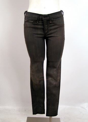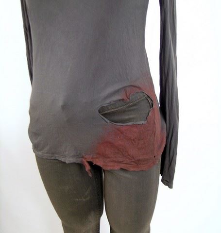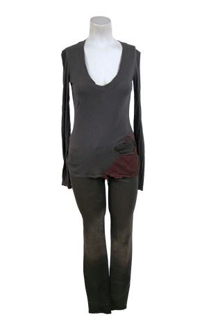 Anne Glass-Mason's (Moon Bloodgood) screen worn outfit in the Season 5, Episodes 5 through 9. Moderate wear. Anne's extraordinary intelligence and beauty need little adornment. Here, she opts for a minimalist ensemble of slate grey long-sleeved v-neck "James Perse" shirt and skinny "Rag & Bone" leggings that are the envy of Overlords throughout the galaxy (though they'll never admit it). Initially a staunch pacifist, Anne has become quite the fighter (to which her blood-stained, hole-ridden shirt will attest). Anne's outfit has been generously "distressed" to show moderate wear. Includes wardrobe tag with Turner Broadcasting System sticker #105015.