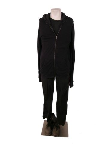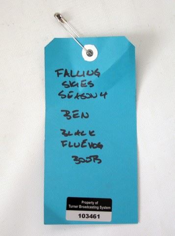 Ben Mason's (Connor Jessup) outfit screen worn by Connor Jessup in Season 5, Episode 7 during stunt sequences. Moderate wear. Ben Mason’s ability to bridge the Espheni and human worlds transcends his physical “spikes” and fuels his spiritual quest to make sense of a universe in turmoil. Likewise, Ben’s singular attire transcends 2nd Mass norms and embraces the independent outsider that he has become. His black "Splendid Mills" hoodie sweatshirt reflects Ben's stripped-down sensibilities, along with his "Armani Exchange" crew neck t-shirt, and black “Joe’s the Brixton” SoCal classic jeans. Perhaps as a cosmic joke, Ben chose a “Tactical Tailor” belt for his tactical-missions outfit and boots from the irreverent designer “John Fluevog” that mirror Ben's straightforward nature with an unexpected touch of genius (metal lace-up hooks at top). Ben Mason's outfit has been generously "distressed" to show moderate wear. Includes wardrobe tag and Turner Broadcasting System sticker #103461.