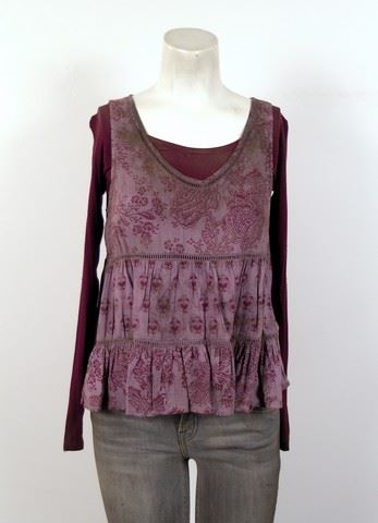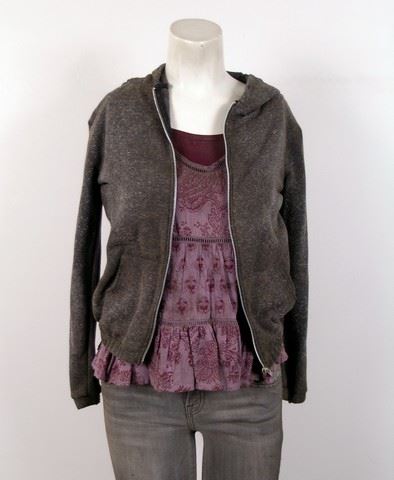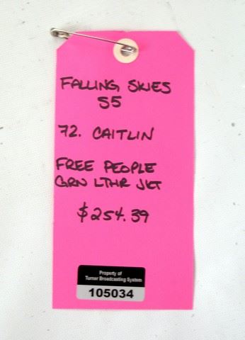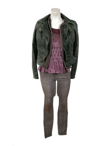 Season 5, Episode 2 - Caitlin's (Julia Sarah Stone) screen worn, distressed forest green pleather two pocket "Free People" motorcycle jacket, medium grey with white flek "Topshop" zipper front hooded sweatshirt, purple ruffle v-neck with floral print "American Eagle" top, merlot long sleeve scoopneck "American Eagle" cropped top, and light grey "Guess" skinny jeans. Includes Turner Broadcasting System sticker #105034.