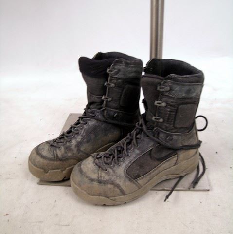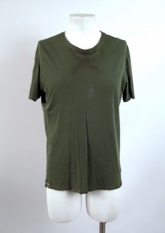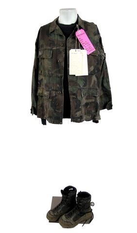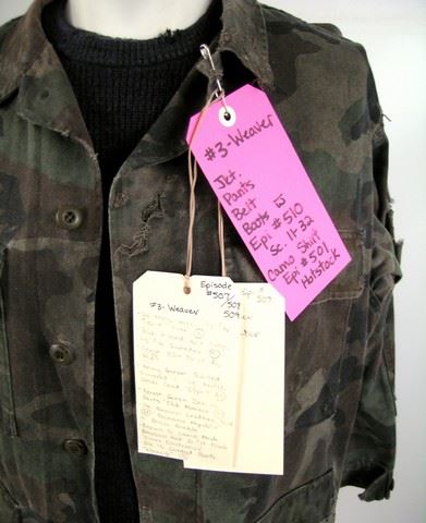 Colonel Dan Weaver's (Will Patton) screen worn outfit in Season 5, Episodes 7, 8, & 9. Dan's green camouflage shirt with U.S. flag, blue ribbed-knit cotton "Paul Smith" sweater, and green crewneck "Vince" t-shirt speak volumes about his no-nonsense style and ideals. His lace-up "Vibram" combat boots were meant for heavy field duty, just like the Colonel himself. Colonel Weaver's outfit has been meticulously "distressed" to show wear from production. Includes 3 wardrobe tags.