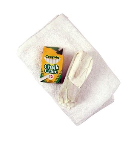 Season 5, Episode 9 - A trifecta of white chalkboard paraphernalia: a white terry cloth towel, a 12-pack box of Crayola white chalk, and a white eraser.