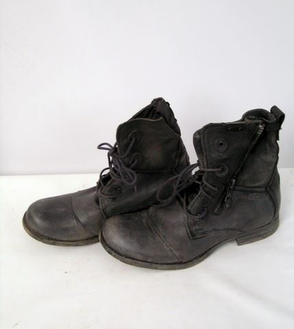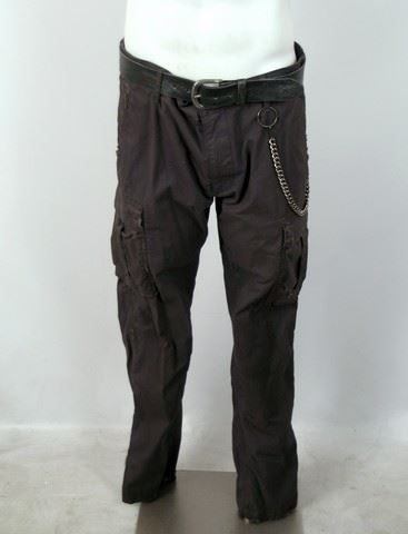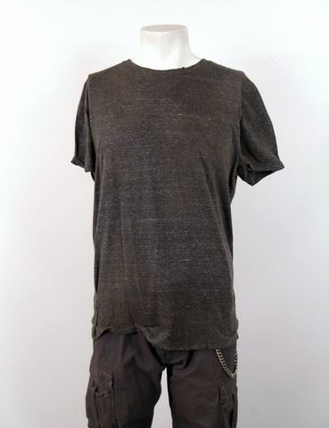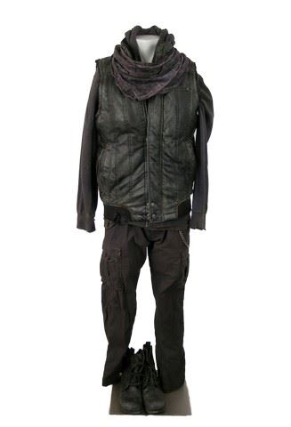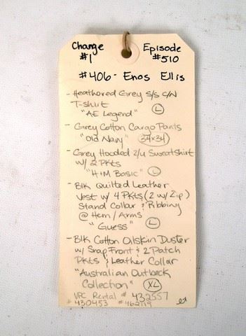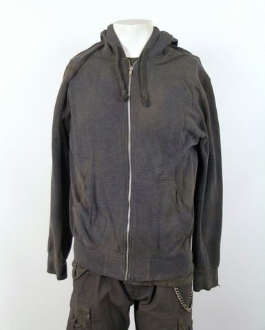 Season 5, Episode 10 (Series Finale) - Enos Ellis screen worn, distressed, black quilted leather with four pockets zipper and button front "Guess" vest, grey zipper front "H&M" hooded sweatshirt, heather grey short sleeve crew neck "AE Legend" t-shirt, black, blue, purple, and grey geometric pattern bandana, black leather belt, silver wallet chain, grey cotton "Old Navy" cargo pants, and black leather with side zip lace up the front "Bunker" boots. Includes wardrobe tag.