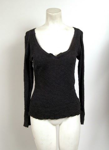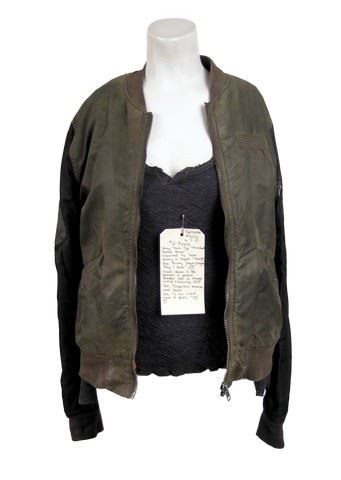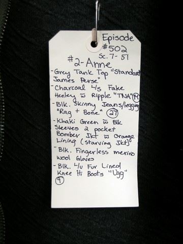 Anne Glass-Mason's (Moon Bloodgood) screen worn outfit in Season 5, Episodes 2. Anne is a layering fanatic but can play it minimalist as well. Here she simply wears a two-pocketed khaki bomber jacket with black sleeves and orange lining, with a charcoal long-sleeved "Henley" textured shirt. Anne's outfit has been "distressed" to show moderate wear. Includes wardrobe tag.