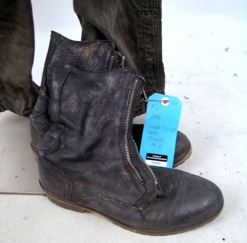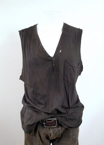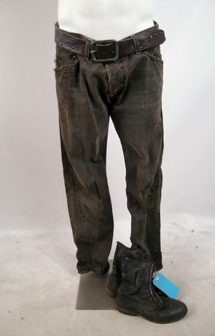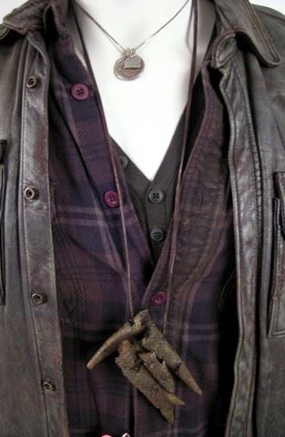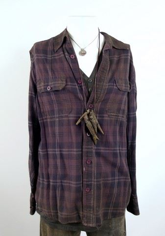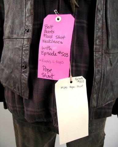 John Pope's (Colin Cunningham) "stunt" outfit screen worn by Colin Cunningham in Season 5, Episode 5 during stunt sequences. He may play an iconoclast, but Colin Cunningham recognizes the importance of precise, duplicate attire to be worn during stunt sequences. Pope's casual ensemble of brown leather jacket with stash-ready front pockets, navy and purple plaid shirt, sleeveless grey "Gap" tank top, and grey denim "Diesel" jeans with creases of worn-out fabric would win top honors at any post-apocalyptic watering hole or pool hall. Undoubtedly, his brown leather belt with alternating studs subtly nabs his fashion-forward look. However, his silver Skitter pendant and rustic Skitter tusks necklace will garner him the most respect. John Pope's outfit has been meticulously "distressed" to appear only minimally dirtied and worn at this point. Includes 2 wardrobe tags, one of which has Turner Broadcasting System sticker #102736.