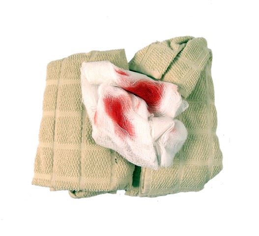 Season 5, Episode 6 - Tan farmhouse towels and bloodied, white cotton gauze bandages used in the "Respite" episode. Approx. 10 1/2" x 6 1/2".