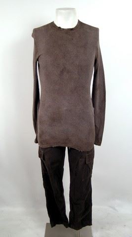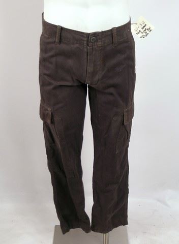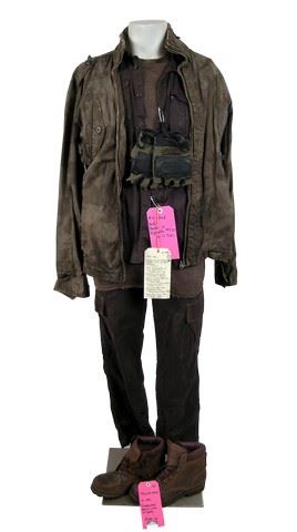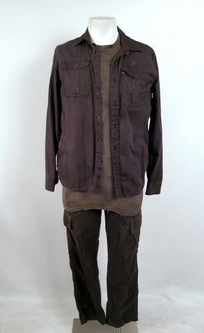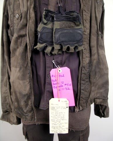Hal Mason's (Drew Roy) screen worn outfit in Season 5, Episodes 1 through 4. Hal Mason goes military chic in this brown camouflage "G-Star" jacket, long-sleeved "G-Star" shirt with chest pockets, and long-sleeved "Vince" crew neck shirt with waffle weave. He can stash extra ammo and detonators in the large pockets of his "Old Navy" cargo pants and still have room left over for military maps. As loyal to the post-apocalyptic dress code as he is to the 2nd Mass, Hal wouldn't be caught dead without his Army green and black cut-off gloves and "Timberland" boots. Hal Mason's outfit has been meticulously "distressed" for production purposes. Includes 3 wardrobe tags, one with Turner Broadcasting System sticker #105041.