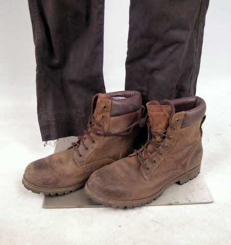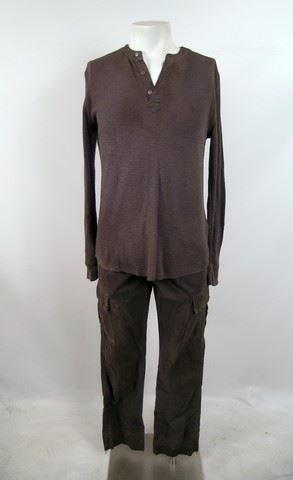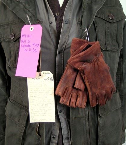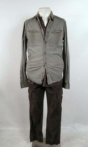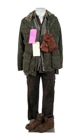 SPOILER ALERT! Hal Mason's (Drew Roy) screen worn outfit in Season 5, Episodes 9 & 10 (Series Finale). Hal Mason didn't become the leading heartthrob of the 2nd Mass militia by wearing any old rags. Even in post-apocalyptic times, he rocks his look in a cargo-pocketed "Lucky Brand" jacket with faux shearling lining and green zipper, grey long-sleeved "Guess" shirt with chest pockets, and the requisite post-invasion henley long-sleeved shirt with a waffle pattern in dark grey. He can stash extra ammo and detonators in the large pockets of his "Old Navy" cargo pants and still have room left over to safeguard valuables for Maggie. As loyal to the post-apocalyptic dress code as he is to his Dad, Hal wouldn't be caught dead without his cut-off gloves in a cognac brown that coordinate with his "Timberland" brown lace-up boots. Hal Mason's outfit has been meticulously studio distressed. Includes 2 wardrobe tags.