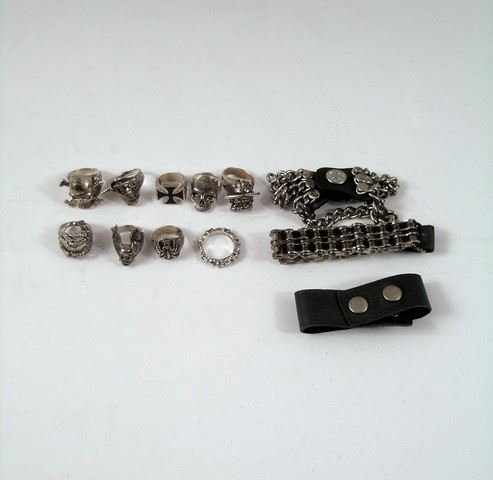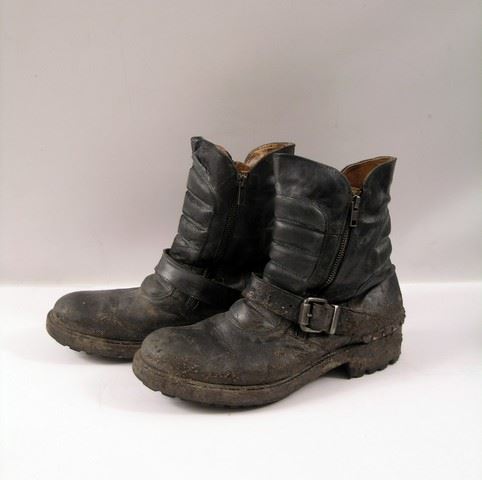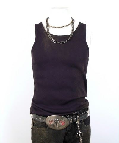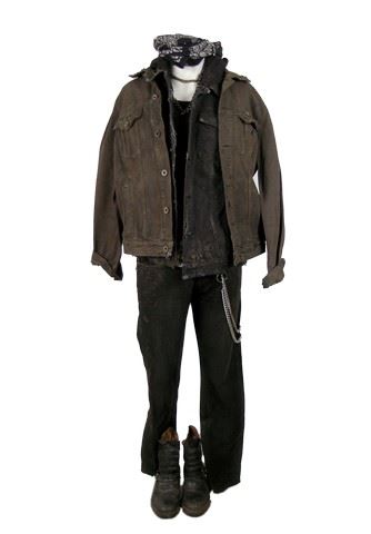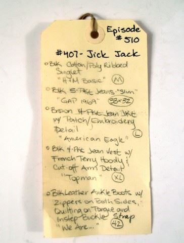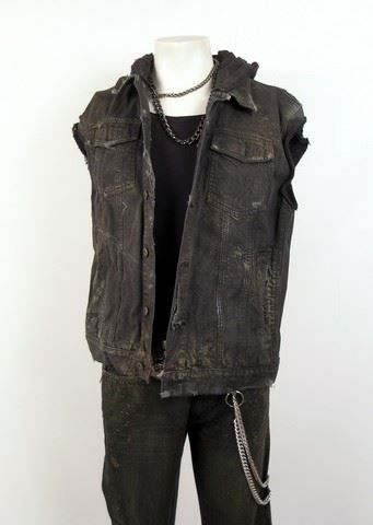 Episode 510 - Jick Jack screen worn, distressed brown four pocket long sleeve button front jacket, black four pocket with French terry hoody cut off arm detail jean vest, black ribbed 'H&M' tank top, black bandana, chain necklaces, three bracelets, ten rings, studded leather belt with large buckle, black denim 'Gap 1969' jeans, and black leather with zippers on both sides 'We Are...' boots. Includes wardrobe tag.