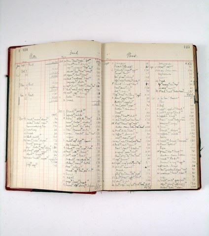 John Pope's (Colin Cunningham) leather bound Army Ledger book, with exceptionally detailed handwritten accounting of what it takes to run an Army. Entries are handwritten with an old-fashioned inkwell fountain pen, and pages are dotted with ink drops and smudges. Headings include categories such as Food, Shelter, Clothing, Advancement, and Recreation, while individual entries delineate the date, amount, and description of expenses such as chicken, tobacco, dog biscuits, cheesecloth, coal, soap, and aspirin. Initial entries, at the outset of the Ledger, detail expenditures from campaigns in the Indian Ocean and Malwar. The General Ledger book is red and black, with gold trim. Approx. 12 3/4" x 9".
