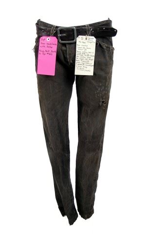 John Pope's (Colin Cunningham) screen worn outfit in Season 5, Episodes 2 through 5. Pope's casual chic "Diesel" jeans of grey denim with creases of worn-out fabric would win top honors at any post-apocalyptic watering hole or pool hall, where the clientele recognize their greasy, overtly worn look as the ideal drifter's fashion statement. His black leather belt with copper studs subtly nabs his fashion-forward look. Pope's pants have been generously "distressed" to show moderate wear. Includes 2 wardrobe tags.