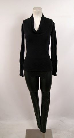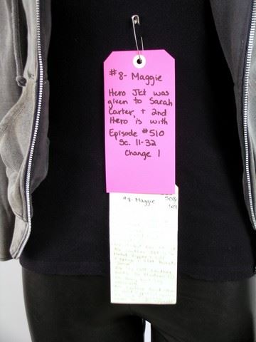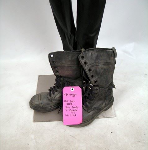 Maggie's (Sarah Carter) screen worn outfit in Season 5, Episodes 5, 6, & 7. Maggie may have pulled a knife on Hal (Drew Roy) the first day they met, but she shows a softer side in this casual, refined ensemble of grey "TNA" hooded sweatshirt, elegantly casual "James Perse" long-sleeved shirt with perfectly draped cowl neck, luxurious grey knit scarf, and couture black pleather skinny "Wilfred" pants. Inspired by the au courant design movement stemming from street culture, Maggie fashions two sets of gloves into a new look by pairing black leather hand gloves with black knit cut-offs into a post-apocalyptic sensation. A resistance fighter to the core, Maggie insists on "Dr. Martens" calf-high boots for stomping through Skitter fields. Maggie's outfit has been meticulously "distressed" by the costume department. Includes 3 wardrobe tags.