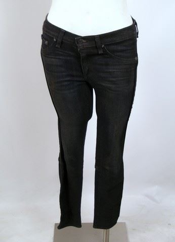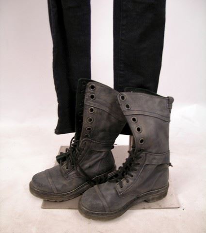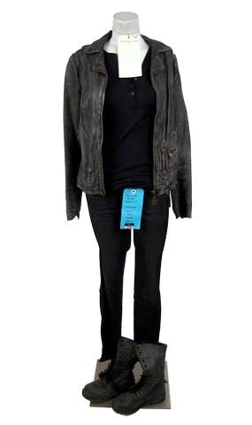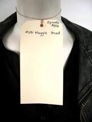 Maggie's (Sarah Carter) outfit screen worn by Sarah Carter in Season 5, Episode 2 during stunt sequences. Moderate wear, tank top "distressed" with a white speck. Equally adept with a Gatling gun or sarcastic quip, Maggie wears clothes like a second skin with an attitude that runway models only wish they could muster. The epitome of post-apocalypse chic, Maggie's model-icious ensemble features a "Doma" lamb leather jacket with plaque pockets and elongated-zipper cuffs, black long-sleeved henley shirt with buttons along the collar, simple black-ribbed "Vince" tank top, and classic "Rag & Bone" skinny jeans in navy blue with black leather piping. A resistance fighter to the core, Maggie insists on "Dr. Martens" calf-high boots for stomping through Skitter fields. Maggie's outfit has been "distressed" to show moderate wear. A white speck appears on the upper right portion of her tank top, to coincide with the storyline. Includes 2 wardrobe tags, one with Turner Broadcasting System sticker #103484.