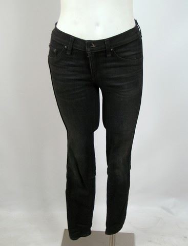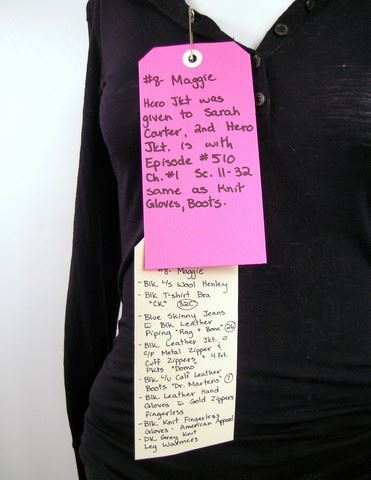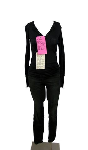 Maggie's (Sarah Carter) screen worn outfit in Season 5, Episodes 1 through 4. Maggie may spend her days torpedoing Mega Mechs or fighting off Hal's (Drew Roy) nefarious ex-girlfriends with omnipotent powers, but she also knows how to kick back in a casual motif of black long-sleeved henley shirt with buttons along the collar, and classic "Rag & Bone" skinny jeans in navy blue with black leather piping. Maggie's outfit has been meticulously "distressed" for filming purposes. Includes 2 wardrobe tags, one with Turner Broadcasting System sticker #103416.