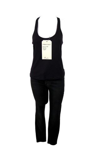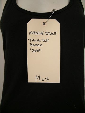 Maggie's (Sarah Carter) outfit screen worn by Sarah Carter in Season 5, Episode 3 during stunt sequences. Maggie’s mix of bravado and guarded vulnerability make her one of the all-time action heroines, whether she's patrolling the perimeter or blowing away outlaws who done her wrong. Here she lets her softer side show through, as she kicks back in this casual outfit of simple black "Gap" tank top and classic "Rich & Skinny" jeans in navy blue. Maggie's outfit has been meticulously "distressed" for filming purposes. Includes wardrobe tag.