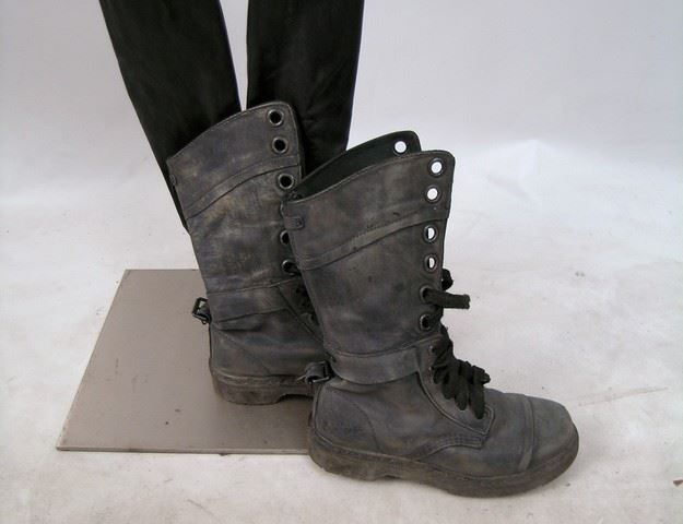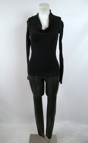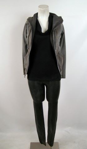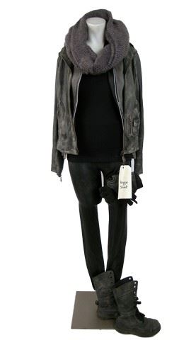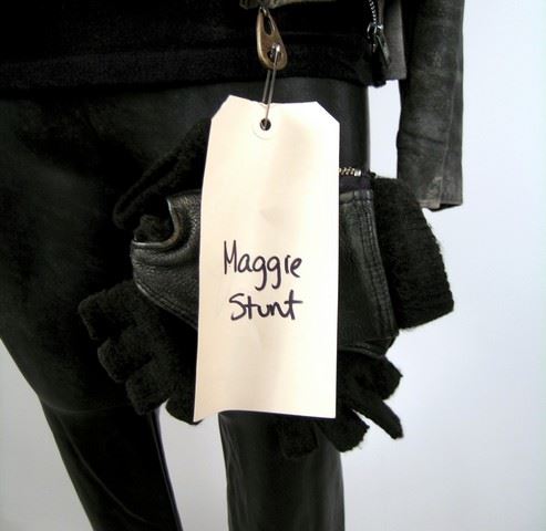 SPOILER ALERT! Maggie's (Sarah Carter) outfit screen worn by Sarah Carter in Season 5, Episode 10 (Series Finale) during stunt sequences. Equally adept with a Gatling gun or sarcastic quip, Maggie wears clothes like a second skin with an attitude that runway models only wish they could muster. The epitome of post-apocalypse chic, Maggie's model-icious ensemble features a "Doma" lamb leather jacket with plaque pockets and elongated-zipper cuffs, elegantly casual "James Perse" long-sleeved shirt with perfectly draped cowl neck, grey "TNA" hooded sweatshirt, luxurious grey knit scarf, and couture black pleather skinny "Wilfred" pants. Inspired by the au courant design movement stemming from street culture, Maggie fashions two sets of gloves into a new look by pairing black leather hand gloves with black knit cut-offs into a post-apocalyptic sensation. A resistance fighter to the core, Maggie insists on "Dr. Martens" calf-high boots for stomping through Skitter fields. Maggie's outfit has been generously "distressed" to show moderate wear. Includes wardrobe tag.