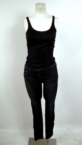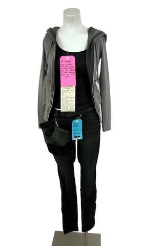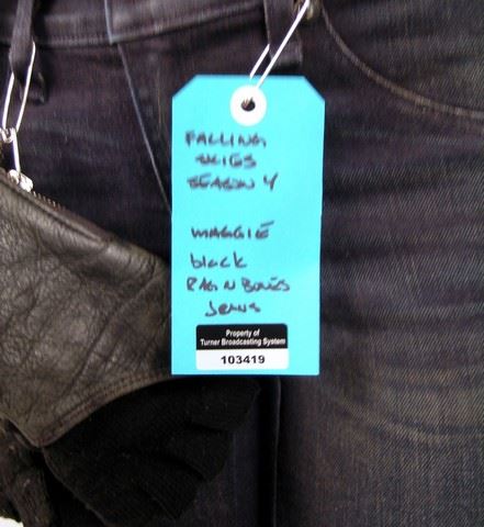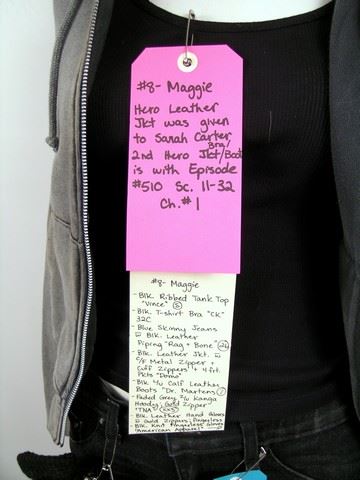 Maggie's (Sarah Carter) screen worn outfit in Season 5, Episode 6. Maggie’s mix of bravado and guarded vulnerability make her one of the all-time action heroines, whether she's patrolling the perimeter or blowing away outlaws who done her wrong. Maggie's softer side shows through in this casual outfit of grey "TNA" hooded sweatshirt, simple black-ribbed "Vince" tank top, and classic "Rag & Bone" skinny jeans in navy blue with black leather piping. Inspired by the au courant design movement stemming from street culture, Maggie fashions two sets of gloves into a new look by pairing black leather hand gloves with black knit cut-offs into a post-apocalyptic sensation. Maggie's outfit has been meticulously "distressed" by the studio for production. Includes 3 wardrobe tags, one with Turner Broadcasting System sticker #103419.