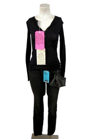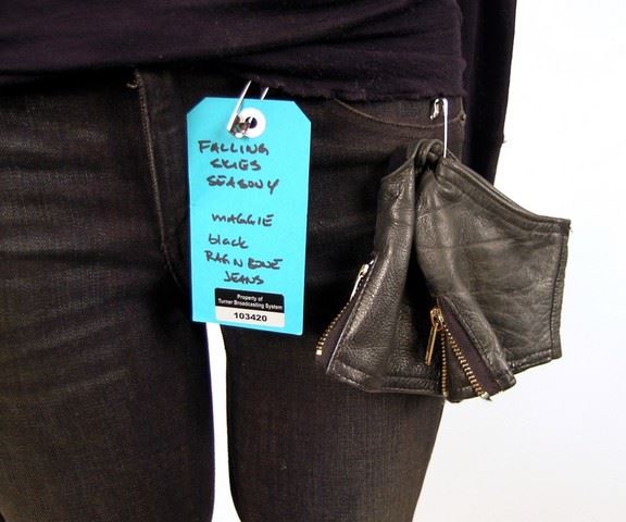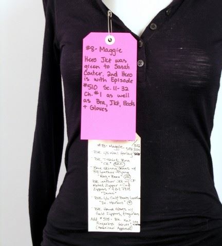 Maggie's (Sarah Carter) screen worn outfit in Season 5, Episodes 1 through 4. Maggie may spend her days torpedoing Mega Mechs or fighting off Hal's (Drew Roy) nefarious ex-girlfriends with omnipotent powers, but she also knows how to kick back in a casual motif of black long-sleeved henley shirt with buttons along the collar, and classic "Rag & Bone" skinny jeans in navy blue with black leather piping. Naturally, she wouldn't be Maggie without her signature black leather hand gloves. Maggie's outfit has been meticulously "distressed" for production purposes. Includes 3 wardrobe tags, one with Turner Broadcasting System sticker #103420.