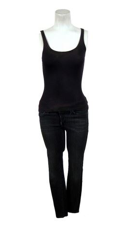 Maggie's (Sarah Carter) screen worn outfit in Season 5, Episodes 7, 8, & 9. Maggie’s mix of bravado and guarded vulnerability make her one of the all-time action heroines, whether she's patrolling the perimeter or blowing away outlaws who done her wrong. Here she lefts her softer side shows through, as she kicks back in this casual outfit of simple black-ribbed "Vince" tank top, and classic "Rich & Skinny" jeans in navy blue. Maggie's outfit has been meticulously "distressed" by the wardrobe department for filming.